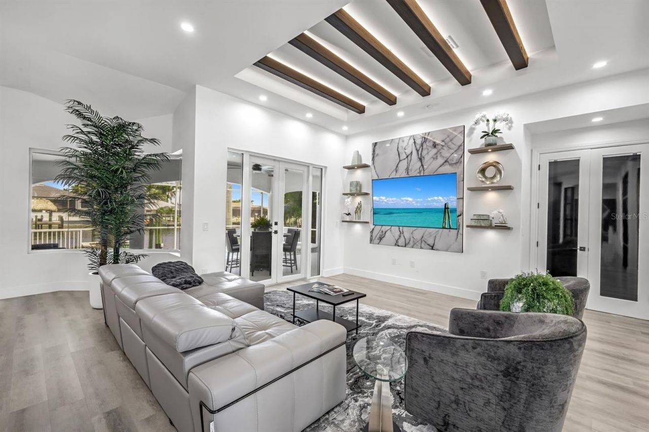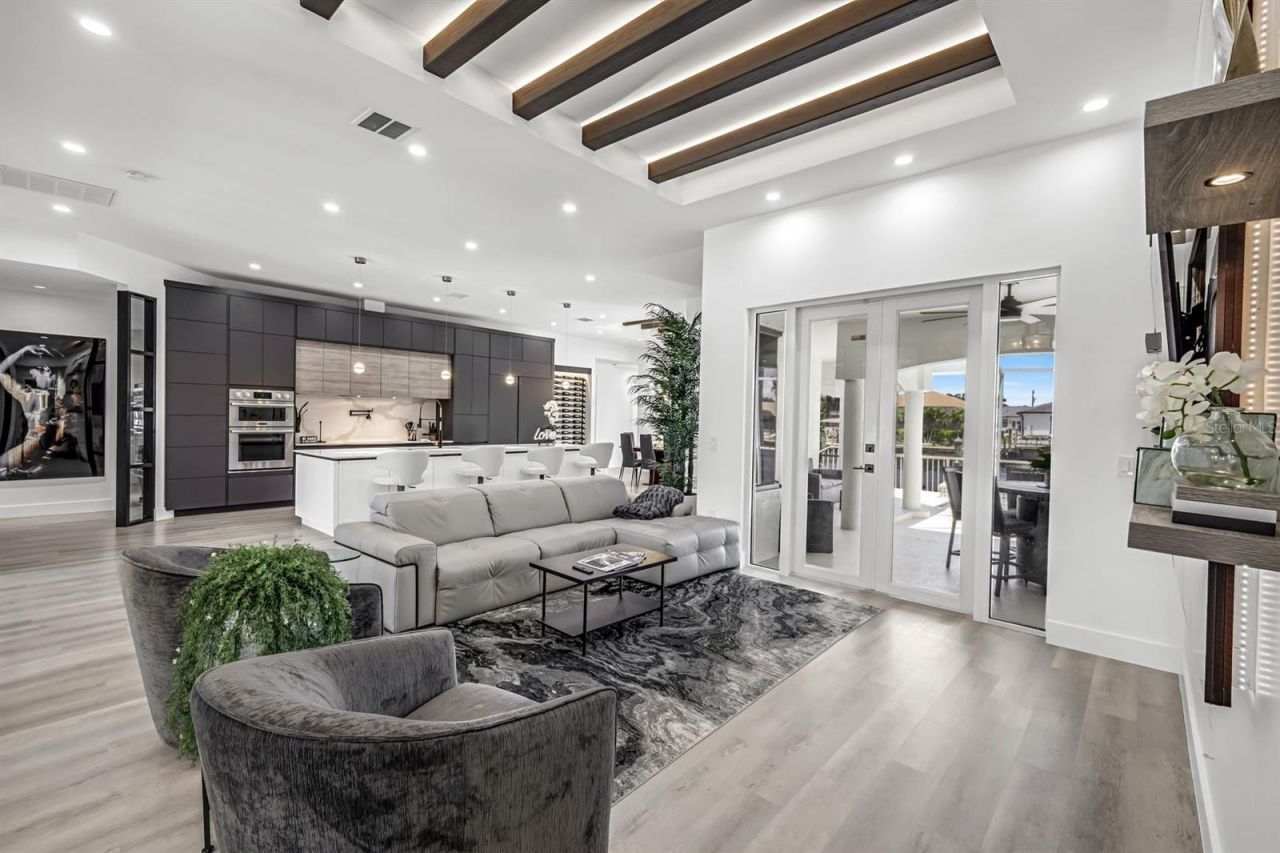 Welcome to your waterfront masterpiece in Cape Coral's Savona boating community. This extraordinary residence offers deep water sailboat access on an oversized canal-ideal for large vessels. Just minutes from the Caloosahatchee River with no bridges, it's a dream location for yachting enthusiasts and anyone seeking luxury waterfront living in sunny Southwest Florida. Boasting $600,000 in premium upgrades, this home has been reimagined with both elegance and functionality in mind. Highlights include 10-foot ceilings, custom lighting, upgraded insulation, newer HVAC, and a freshly painted interior and exterior. The modern open-concept layout seamlessly blends indoor and outdoor living. At the heart of the home is a chef's kitchen, complete with: an oversized island with under-mount lighting and deep sink with disposal, Subzero 48 refrigerator/freezer, Signature 2023 appliances including a steam oven, microwave, dishwasher, wine fridge, and a custom pullout coffee bar and pot filler for added convenience. The elegant dining area seats eight and opens via French doors to a resort-style patio with tranquil water views of the Sonata Canal. The Primary bedroom suite boasts French doors to the lanai, a stunning porcelain feature wall and mirror, and a designer walk-in closet with ambient lighting. The luxurious primary ensuite boasts a floating toilet, rain showerhead, body sprays, stylish vanities, modern plumbing fixtures, and designer lighting throughout. Two additional European-inspired bathrooms offer designer finishes and floor-to-ceiling porcelain tile with LED-lit mirrors. Outdoor living is equally impressive, with a newly painted pool lanai, new lighting and ceiling fan, and upgraded pool lighting to enhance nighttime ambiance. Boaters will love the 70-foot dock and captain's walk, complete with lighting, electrical, and water-perfect for accommodating up to a 65-foot yacht. Best of all, this home is elevated above the floodplain and has never experienced water intrusion, offering true peace of mind during storm season. Don't miss your chance to own this exclusive waterfront oasis-schedule your private tour today!